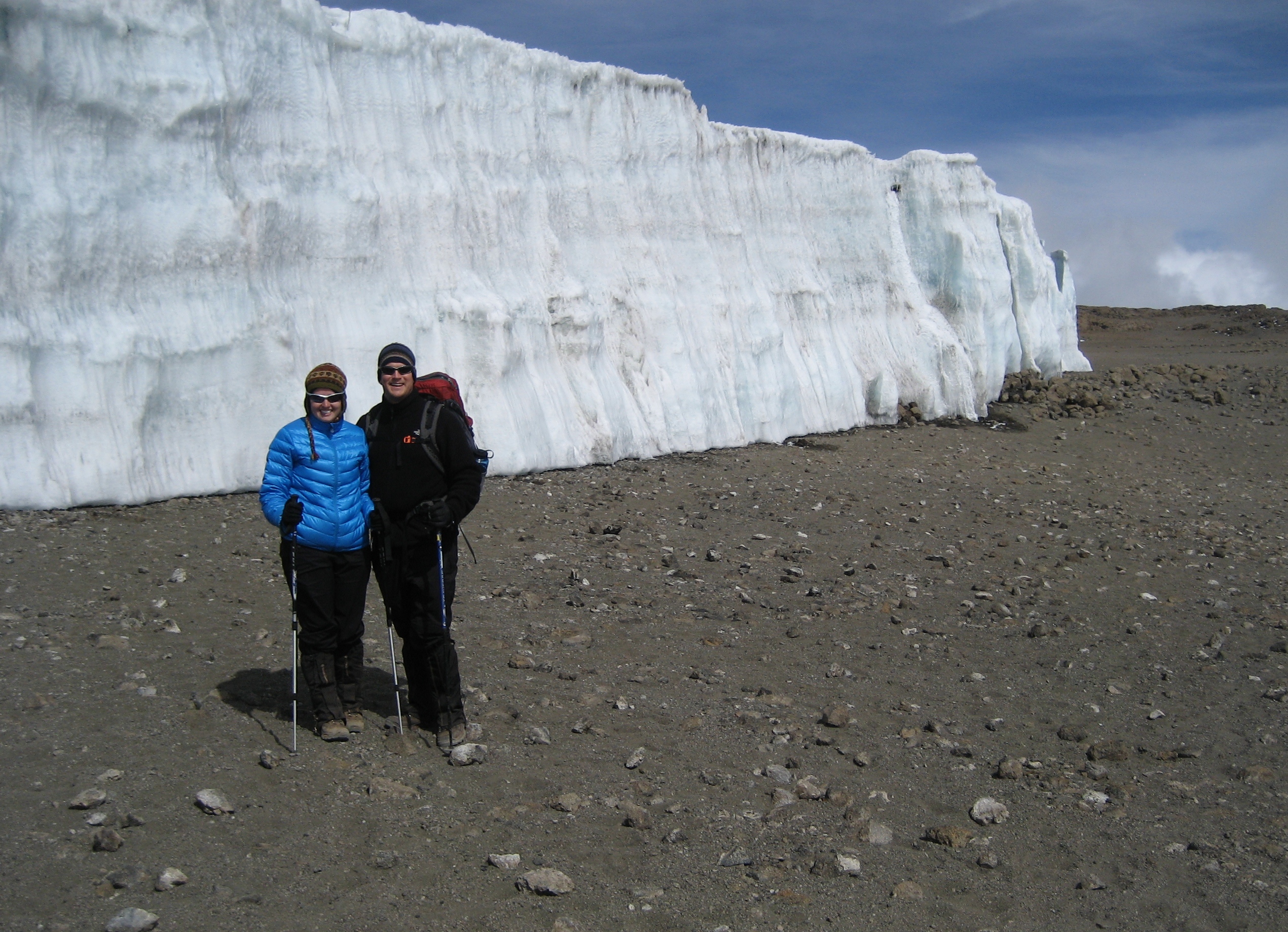 Stephen and Cindy Koester just sent us this photo from their Kilimanjaro climb at the Furtwängler Glacier near Crater Camp just 1,000 feet from their summit of Kilimanjaro. They came up the Lemosho Route and through the Western Breach. A couple people had to descend due to altitude sickness, and although they had bad weather much of the trip, it looks as though near the summit, the weather started to improve for these determined partners.