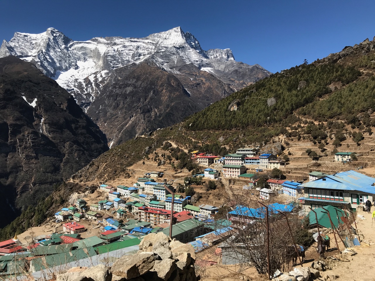 At 11,287 feet, Namche is situated just at the point where altitude-related health issues may start to kick in for some people. One important part of dealing with altitude is drinking lots of water, and another is ascending slowly — hence two nights in Namche.