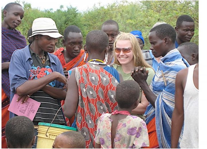 This is exactly what happened when we descended upon a remote village about 20 miles away from Mt. Kilimanjaro, way out in the bush. Within 20 minutes or arriving at the village, there were more than 50 Masai tribesmen surrounding us. This picture shows us Kellie Marshall, surrounded by Masai, who were intently listening to the Masai woman tell Kellie that she should come to the village and teach.