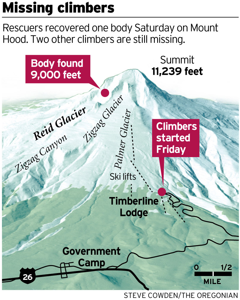 The search for two missing climbers is now in its third full day after the body of Luke T. Gullberg, who at 26 had climbed the 11,240-foot Mt. Hood six times, was recovered at 9,000 feet on Saturday. Due to what has been called extreme avalanche danger, the search has been limited to helicopter surveillance since Sunday morning, and the only climbers who set out early Sunday morning returned by 6:15 a.m. due to the poor conditions.