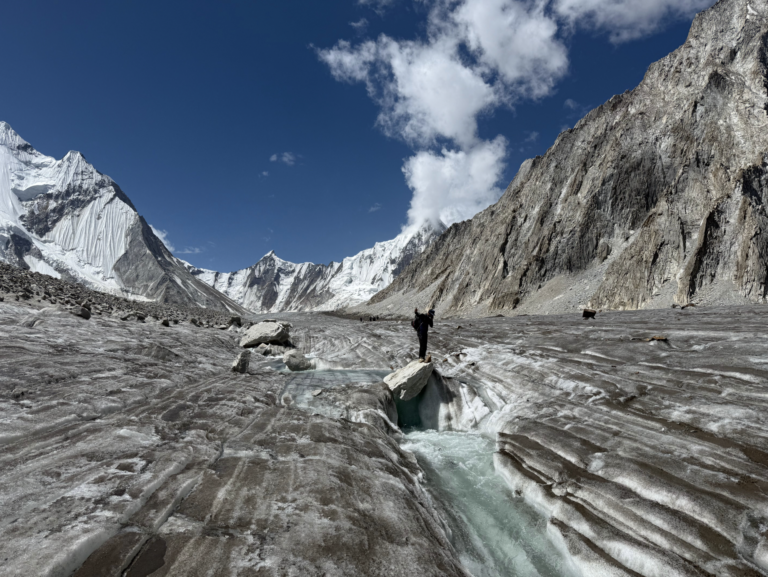 Today is a 6–8 hour moderately difficult walk on glacier terrain. This is often where you begin to truly feel the effects of altitude, but it coincides with a turning point in the trek as the surrounding landscape becomes increasingly otherworldly. From camp, you’ll have sweeping views of Masherbrum, Gasherbrum IV, and the summit of Broad Peak. As we move deeper into the Karakoram, the challenge of elevation is offset by the spectacle around us—towering ice formations, meltwater rivers cutting through the glacier, and a dramatic, high-alpine environment that feels far removed from the everyday world. We have officially entered the heart of the Karakoram.