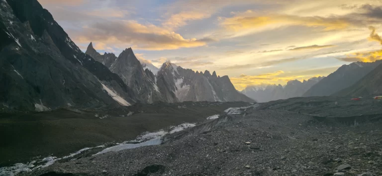 Today, we continue along the glacier as far as Urdukas before hugging its edge and descending to Liligo Camp. This marks our first camp on the return journey that is not located on the glacier—a welcome reprieve for many after several nights on the cold ice. Liligo is a quiet, tucked-away campsite that sees fewer trekkers and offers excellent views of the dramatic Trango Towers rising above the valley.