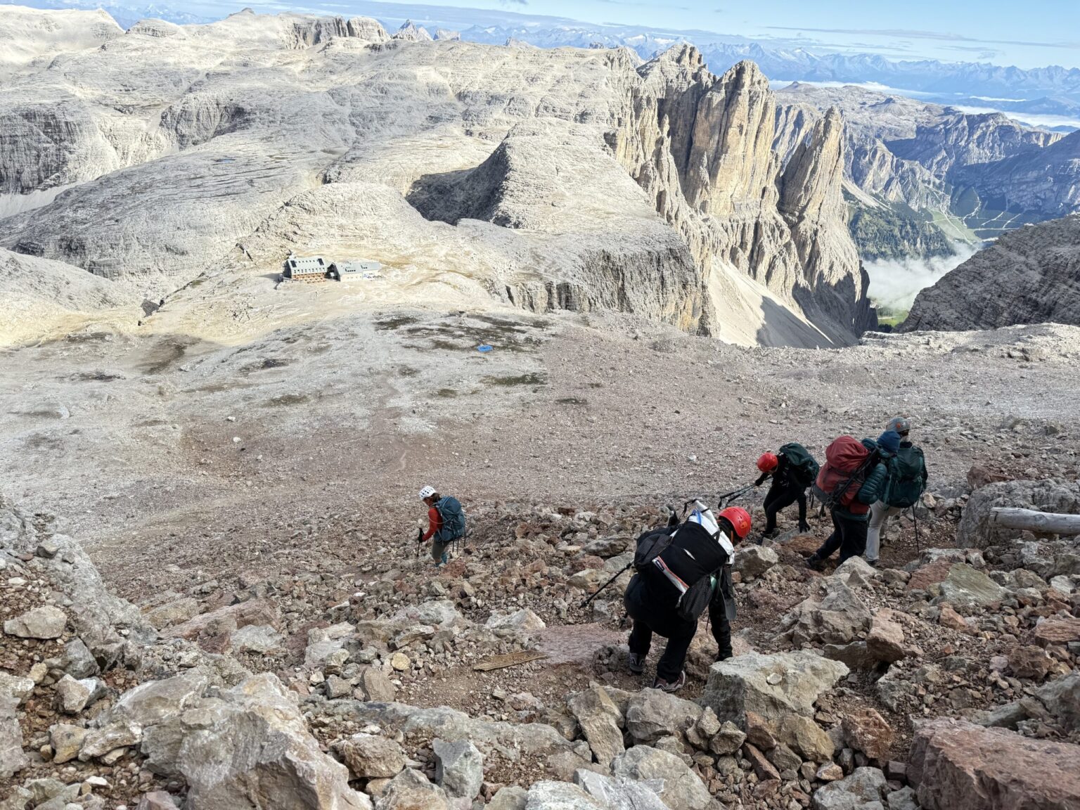 Today we will retrace part of yesterday’s route up to the Bullejoch as we pass by a couple of small lakes. After a moderate climb we will pass the Bullejoch Hut, one of the smallest huts in the Dolomites. We will then drop packs and climb climb the Kaisersteig via ferrata. Then a steady descent brings us to our next Hut, the Zsigmondy hut. Zsigmondy, like Locatelli, is an older hut with lots of ambience and it sits below the imposing Zwolferkofel.