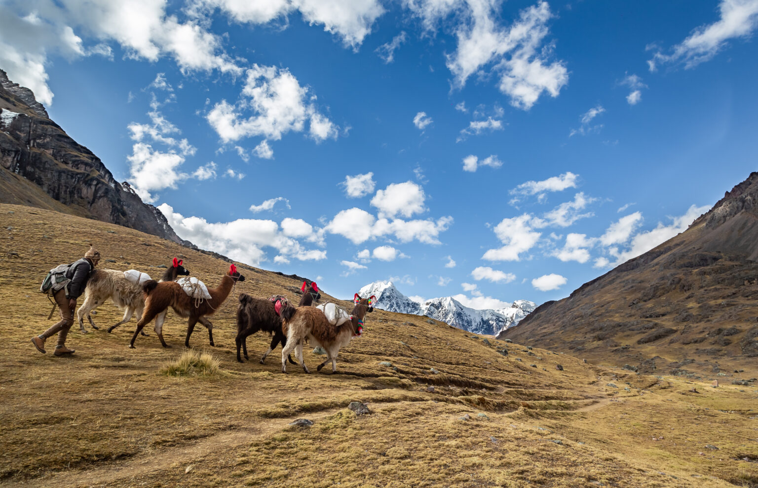 Trek through wide glacier valleys filled with alpacas and llamas. Pass waterfalls and glacial landscapes before reaching Machuraccay Tambo Lodge, where your bags arrive by llama caravan and a local family hosts the evening.